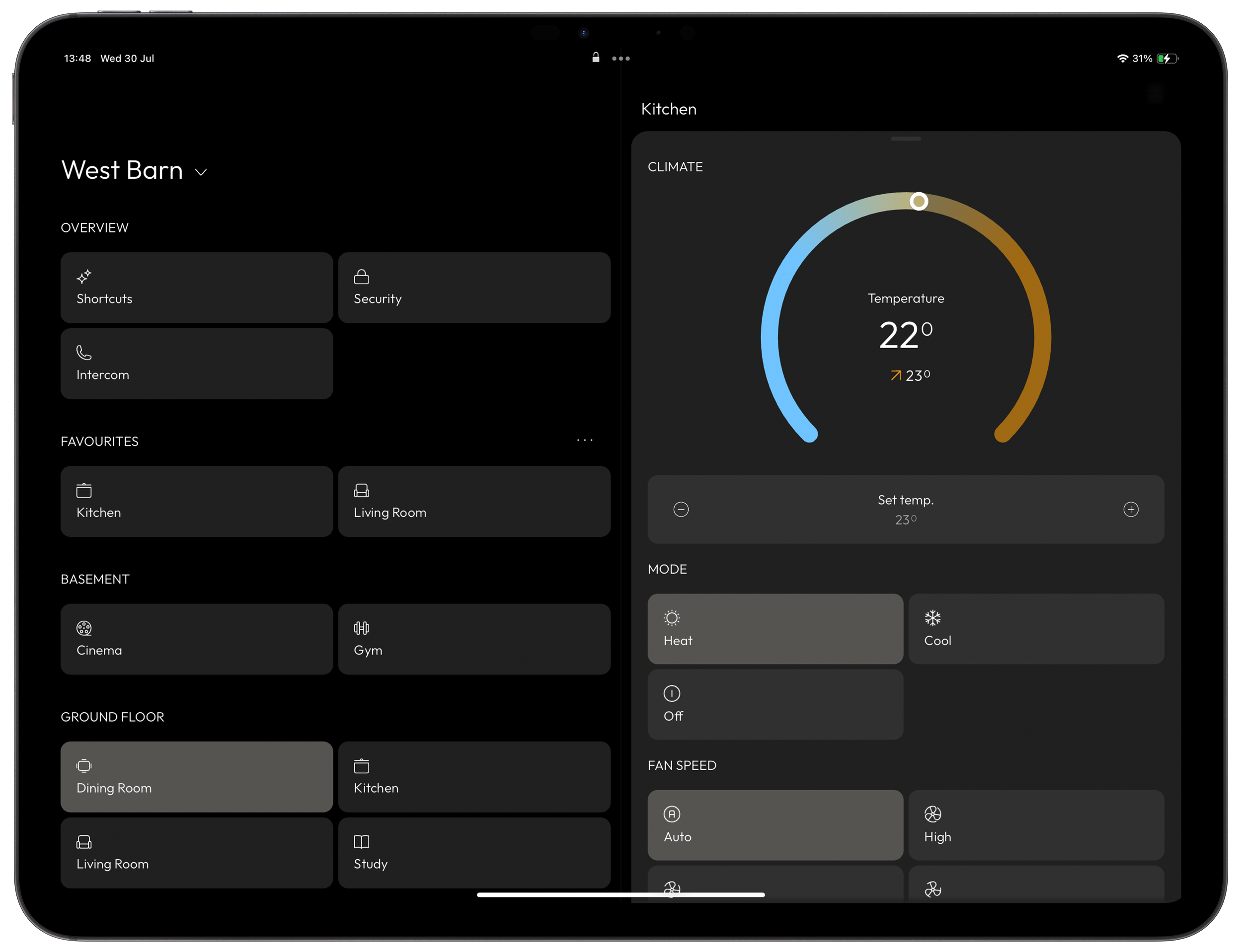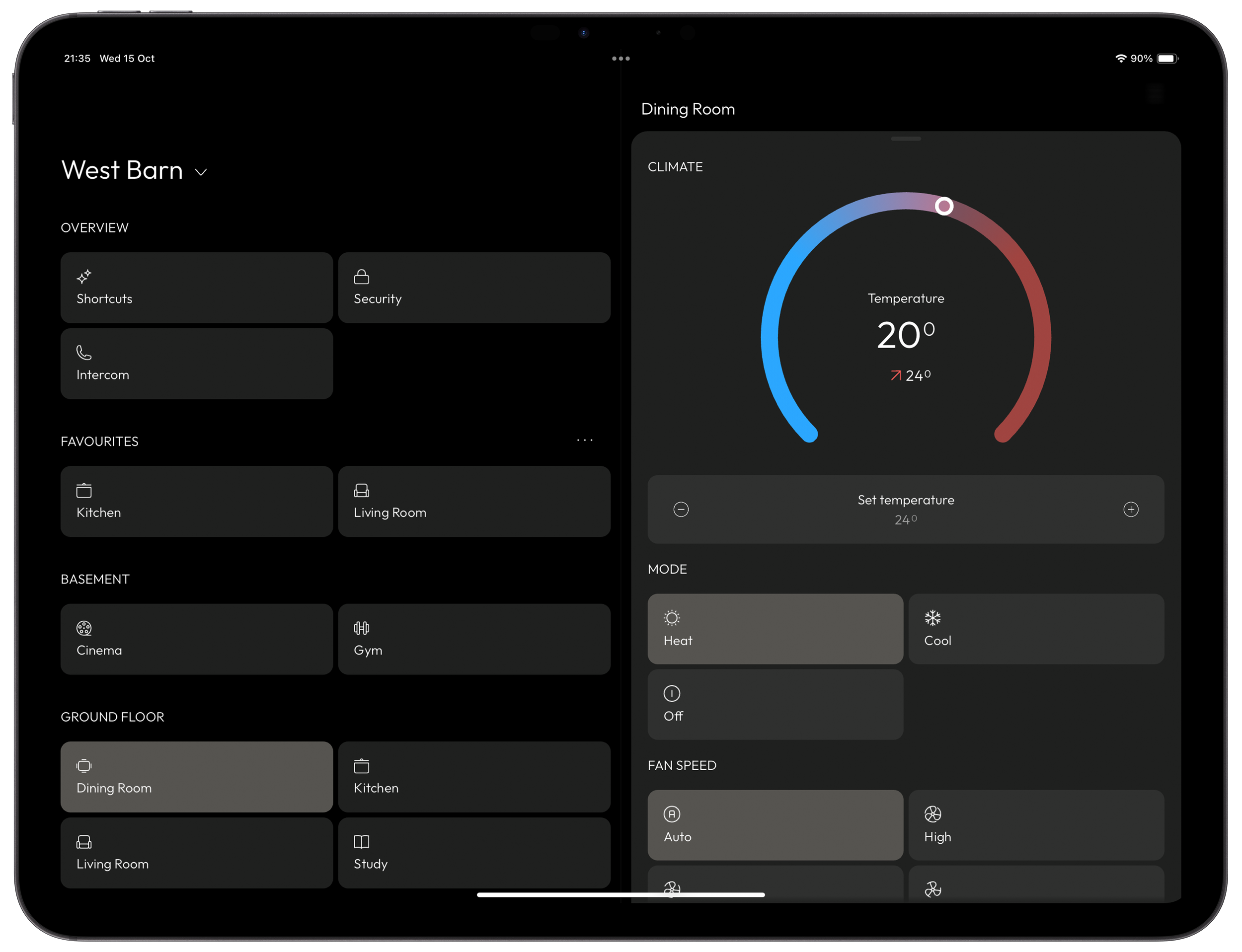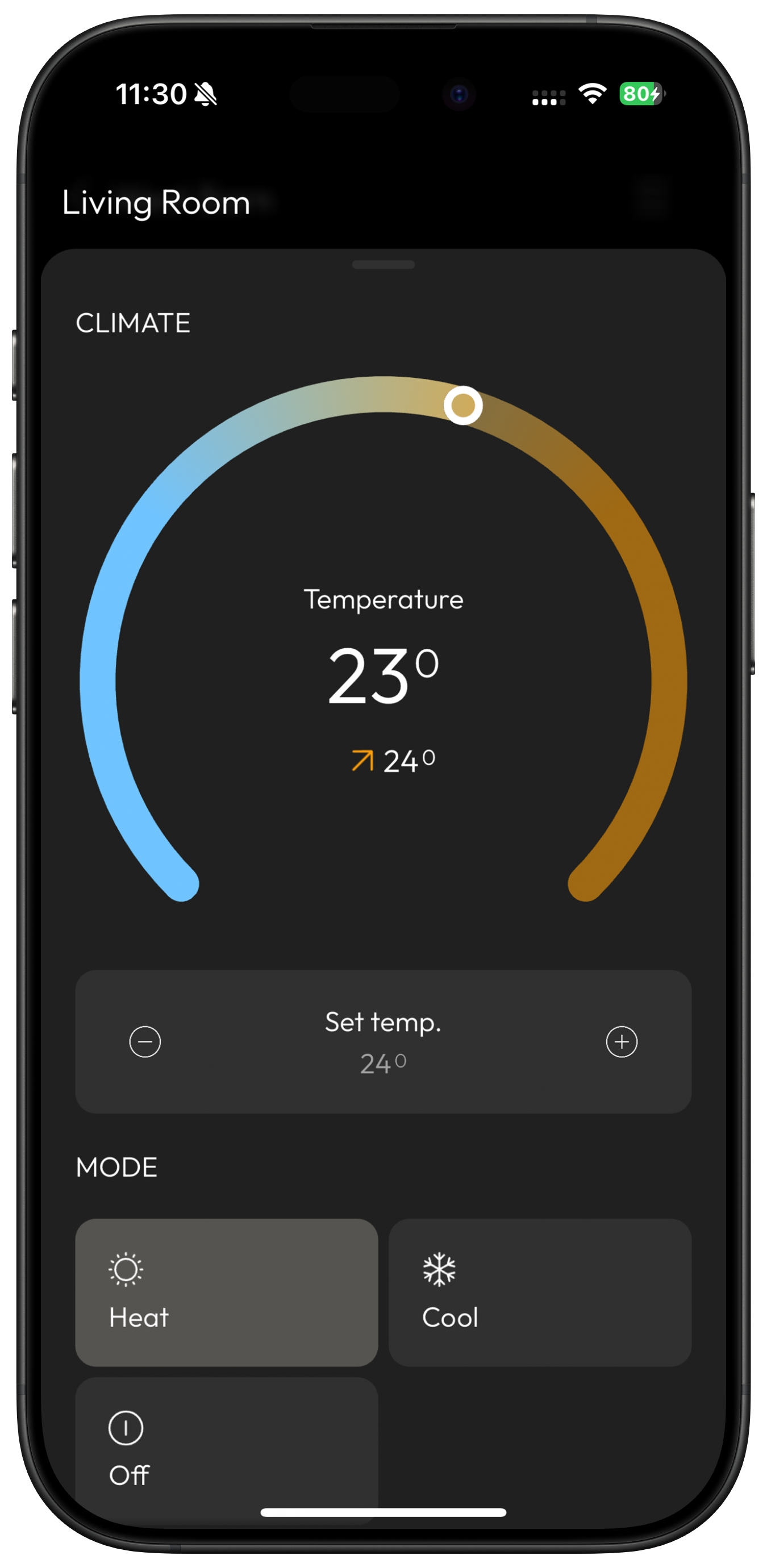 Manage individual lights, grouped fixtures, or entire lighting scenes with precision and simplicity to create the perfect ambience. Adjust individual shades or coordinated shade scenes to match your mood and preferences. Tailored comfort in every room. ORO puts control of temperature, fans, underfloor heating, and climate modes at your fingertips.